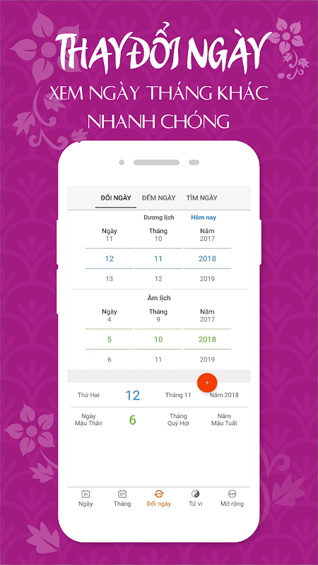 - Phần đổi ngày,bạn có thể đổi ngày dương sang âm và ngược lại,thuận lợi để sắp xếp một số ngày đại sự như cưới hỏi,cúng giỗ,làm nhà...