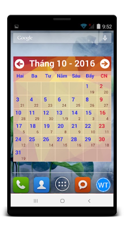 - Một widget lịch tháng cực kỳ pro và tiện dụng ngoài màn hình chính cho bạn tra cứu lịch âm dương nhanh chóng.