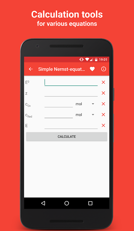 The tools cover different topics from solution properties like pH-value to physicochemical calculations like the Boyle-Mariotte-Law. Additionally the app features an unit converter for different values like length, volume, weight etc.