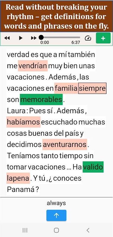 Alat baca terdepan kami membuat Anda terus bergerak tanpa merusak ritme Anda. Temukan kata atau frasa yang tidak Anda mengerti? Tidak masalah!