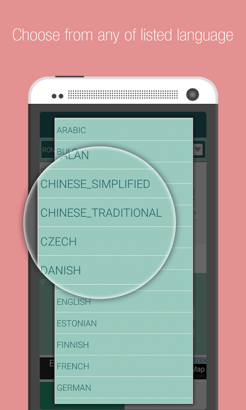 Dari Cina Sederhana, Cina tradisional untuk Italia, Ceko, Denmark, Belanda, Inggris, Estonia, Finlandia, Perancis, Jerman, aplikasi dapat mengaktifkan terjemahan bebas sederhana. Kami juga termasuk beberapa bahasa lain yang banyak digunakan di negara-negara mereka masing-masing. Kita berbicara tentang Yunani, Ibrani dan Slovenia Bahasa (Slovenia, Serbia dan Kroasia)