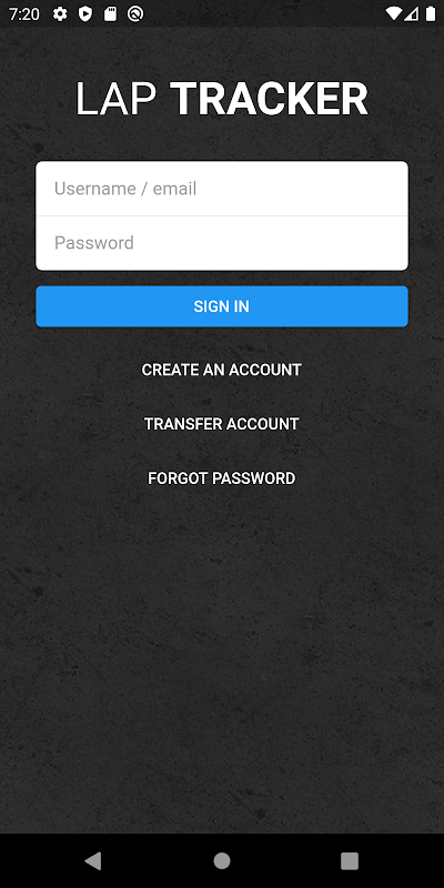 Jika Anda menggunakan Lap Tracker versi lama, Anda perlu mentransfer akun Anda. Alih-alih masuk atau mendaftar akun baru, klik akun transfer dan masuk dengan alamat email dan kata sandi akun lama Anda. Semua kendaraan dan hari lintasan Anda akan disalin ke aplikasi baru.