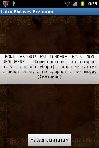 Aplikasi ini akan membantu Anda mempelajari frase menangkap lebih dibuat pada waktu yang berbeda di hebat Latin - dapat dibaca sebagai seluruh database kutipan dan setiap hari untuk membaca kalimat acak dan membawanya ke layanan untuk hari. Pengaturan memungkinkan Anda untuk mengaktifkan penerimaan frase acak dalam status bar di waktu yang ditetapkan pengguna, dengan pengulangan setiap hari.