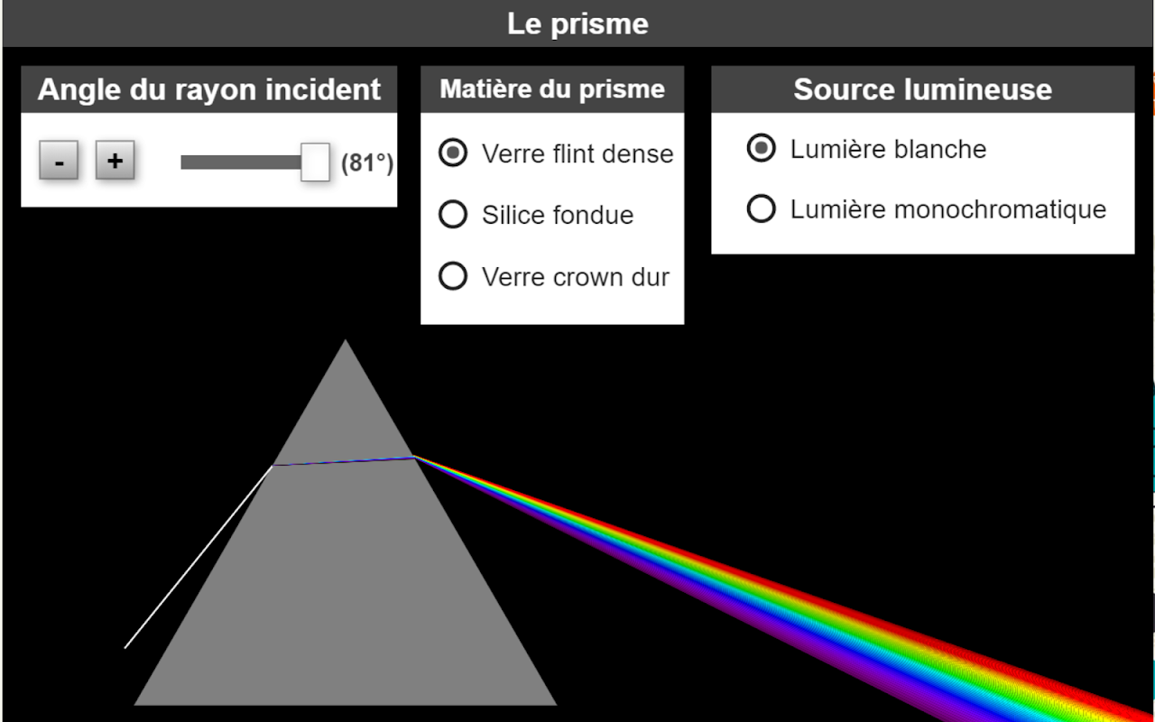 Animasi "Prism" digunakan untuk mempelajari dispersi cahaya putih melalui prisma (Anda dapat memilih antara tiga indeks prisma yang berbeda).