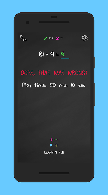 Learn 4 Fun works like a screen lock. Before accessing the apps or games on the phone or tablet, your kids have to solve some math exercises first and are rewarded with play time.