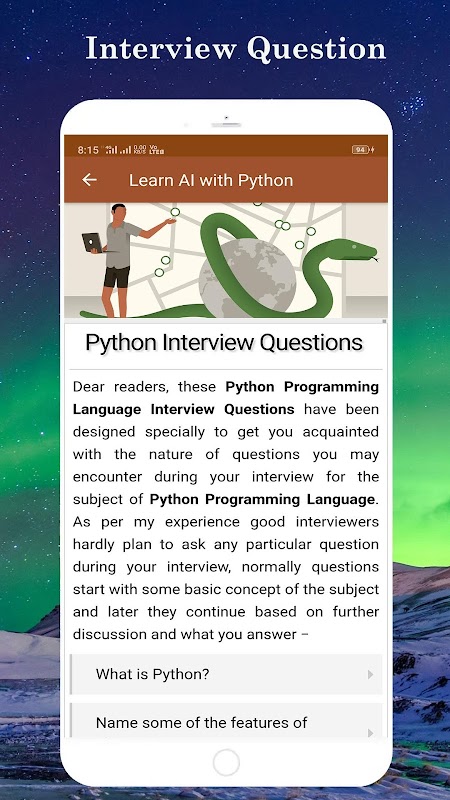 Ini juga berguna untuk belajar bahasa pemrograman python. Dalam aplikasi ini disediakan banyak contoh kehidupan nyata yang berguna dari bahasa pemrograman python, AI dengan tanya jawab wawancara python dan juga disediakan compiler python.