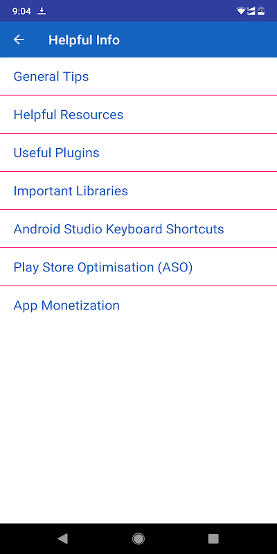 Aplikasi ini terdiri dari tutorial, contoh kode, demo, dan penjelasan teoretis Anda dapat mempelajari konsep dasar pengembangan aplikasi android, konsep dan contoh pengembangan android tingkat pemula dengan kode dan demo, fitur android tingkat lanjut dengan kode dan demo, kode aplikasi android profesional dengan penjelasan dan segmen info bermanfaat dengan informasi penting tentang menjadi pengembang android profesional dan pengetahuan tentang berbagai hal penting terkait dengan Pengembangan Aplikasi Android. Selanjutnya, kami telah memberikan 9 aplikasi profesional yang sepenuhnya dikembangkan dengan teknik pengkodean pengembangan android canggih yang dapat Anda beli dan tingkatkan keterampilan Anda lebih lanjut.