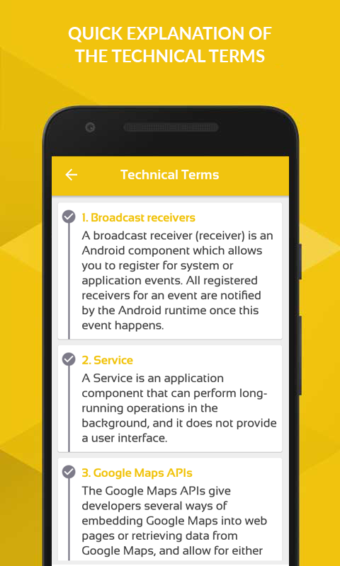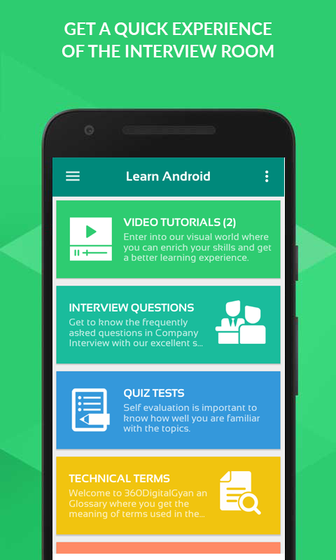 • Android Quiz- Para pengembang dapat menguji pengetahuan mereka untuk topik dan melacak kemajuan mereka. Pengguna dapat memilih jawaban untuk soal pilihan ganda tipe pertanyaan-pertanyaan ini dan meninjau mereka setelah penyerahan