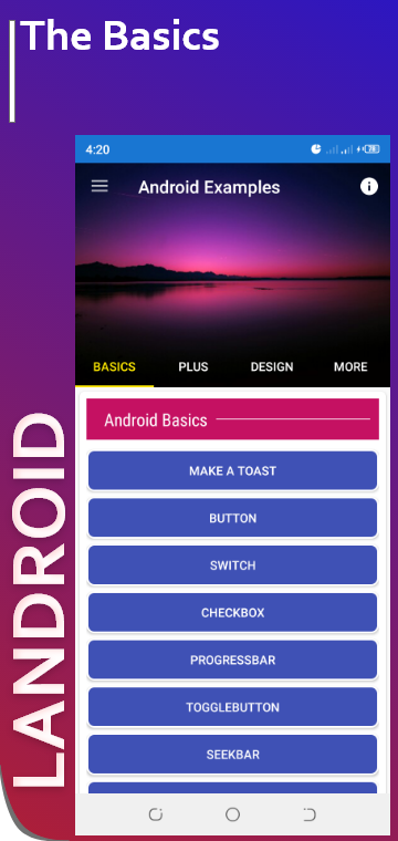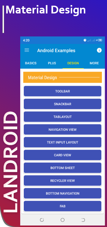 Aplikasi ini berisi 100+ contoh Android. itu terutama dirancang untuk pemula untuk mulai belajar pengembangan aplikasi android dengan contoh. Anda dapat menyalin kode sumber dari contoh apa pun dari aplikasi ini. semua contoh aplikasi ini dicoba dan diuji di Android Studio.