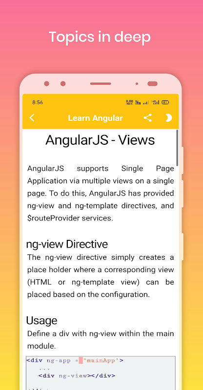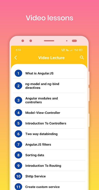 Learn Angular memiliki antarmuka pengguna yang sangat sederhana. ini adalah aplikasi terbaik yang memungkinkan Anda mempelajari bahasa pemrograman reaksi secara gratis. Unduh aplikasinya sekarang untuk menjadi Learn Angular.