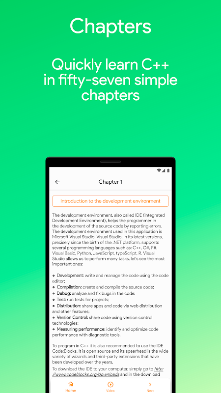 Aplikasi ini memiliki antarmuka yang sangat sederhana dan dapat digunakan oleh semua orang. Belajar C ++ PRO sedang offline dan dapat digunakan kapan saja dan di mana saja. Ini sangat direkomendasikan bagi mereka yang ingin belajar C ++ tetapi juga bagi mereka yang ingin memperdalam atau memeriksanya.