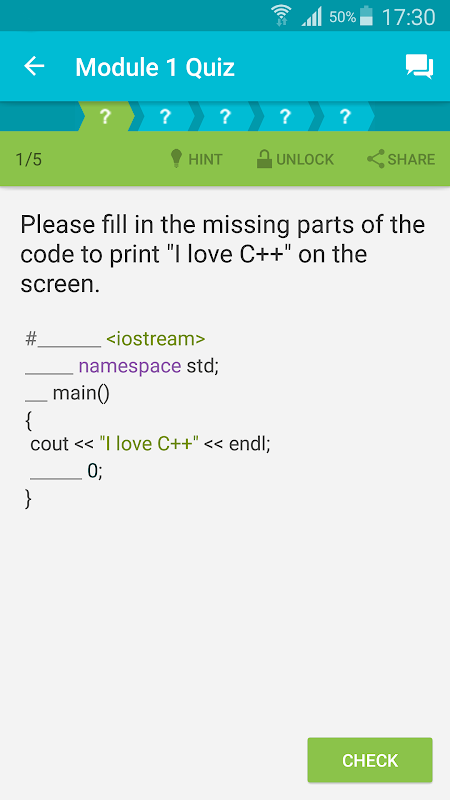 Learn C++ includes over 80 lessons split into 8 levels that cover basic concepts, data types, arrays, pointers, conditional statements, loops, functions, classes and objects, inheritance & polymorphism, templates, exceptions and files. Unlock new levels, quizzes, collect points and compete with your peers around the world.