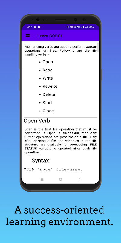 Aplikasi ini dirancang untuk pemrogram perangkat lunak yang ingin mempelajari dasar-dasar COBOL. Ini memberikan pemahaman yang cukup tentang bahasa pemrograman COBOL dari mana Anda dapat membawa diri Anda ke tingkat keahlian yang lebih tinggi.