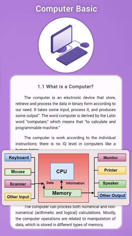 Aplikasi Pelajari Kursus Komputer dan Gambar berisi kursus dasar komputer dan kursus lanjutan untuk pemula serta ahli untuk meningkatkan keterampilan komputer Anda. Aplikasi Dasar-Dasar Komputer ini sepenuhnya offline dan GRATIS. Kursus belajar komputer adalah salah satu aplikasi kursus komputer terbaik untuk semua pendatang baru yang tertarik mempelajari komputer dasar di ponsel mereka sendiri.
