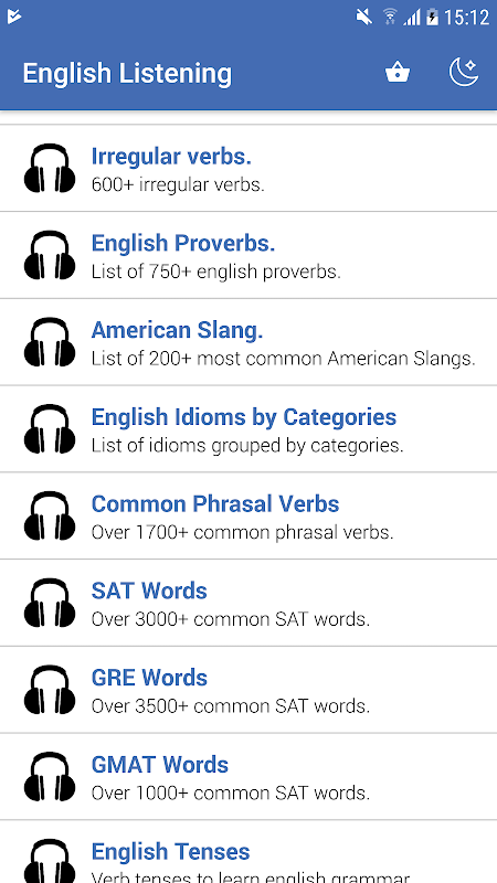 Tingkat menengah akan membantu Anda belajar berbicara bahasa Inggris dengan lebih lancar, dalam waktu yang lebih singkat. Menggunakan aplikasi kita adalah cara terbaik untuk berlatih mendengarkan secara aktif dan cermat. Aplikasi ini memiliki koleksi pelajaran bahasa Inggris yang baik di dunia nyata, sehingga Anda dapat mendengar bahasa Inggris yang digunakan orang-orang setiap hari.