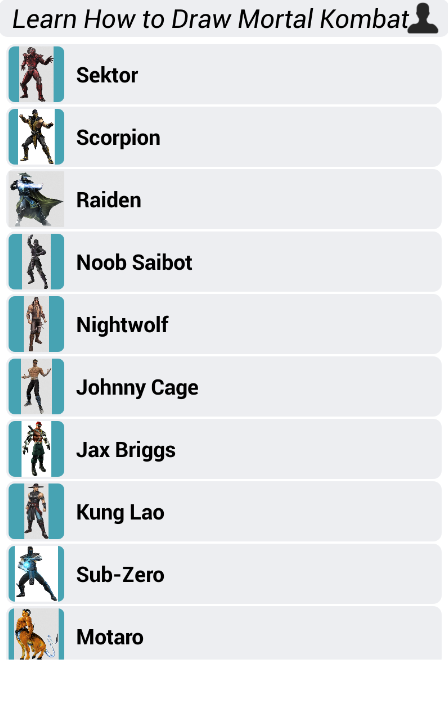 Let’s draw your favorite item from Mortal Kombat characters step by step in a new application for mobile drawing! just take a paper and a pencil, choose the characters you like. It is very easy to use.
