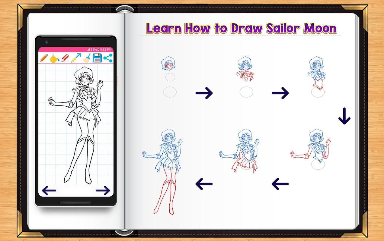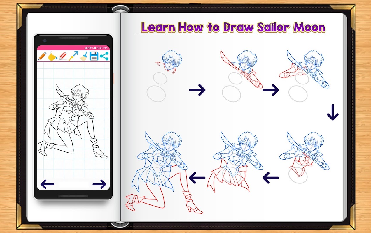 Learn How to Draw Sailor Moon Characters is a fast and simple step by step guide for drawing your favorite Sailor Moon Character. Its step by step instructions improve creativity and confidence in your young ones while drawing their favorite sailor character.