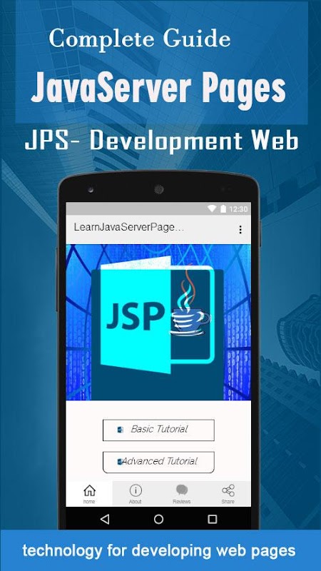 Aplikasi ini disusun untuk membantu memahami fungsi dasar dan lanjutan dari Java Server Pages (JSP) untuk mengembangkan aplikasi web Anda. Setelah menyelesaikan tutorial ini Anda akan menemukan diri Anda pada tingkat yang moderat keahlian dalam menggunakan JSP dari mana Anda dapat mengambil sendiri ke tingkat berikutnya. belajar So..Let tentang Java Server Pages sekarang dengan aplikasi ini di gadget Anda.