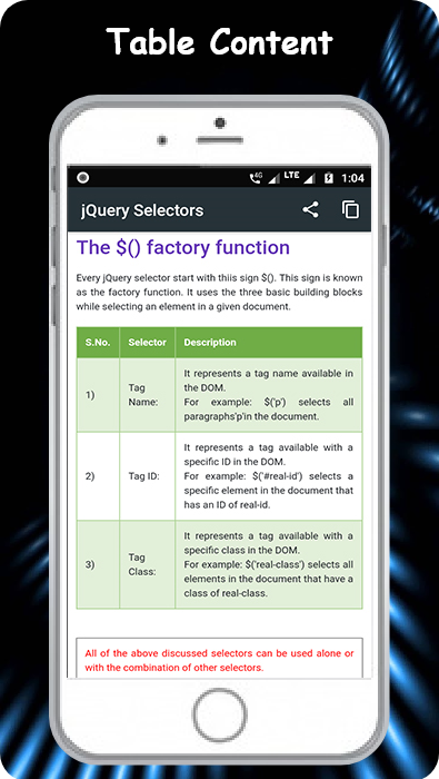 Learn JQuery adalah aplikasi yang sangat berguna bagi semua siswa untuk menghapus setiap konsep dasar dan lanjutan dari Bahasa JQuery.