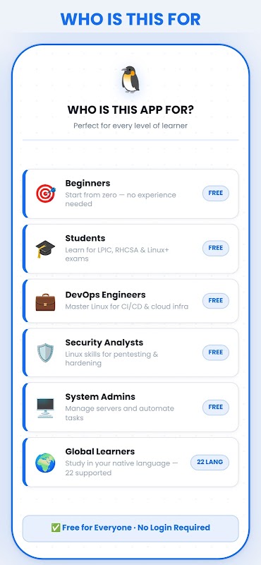 Learn Linux adalah aplikasi gratis terlengkap untuk menguasai Linux dari awal. Baik Anda seorang pemula atau pengembang berpengalaman yang mendalami pemrograman shell, administrasi sistem, dan DevOps — aplikasi ini mencakup perintah Linux, pemrograman bash, jaringan, komputasi awan, dan tren teknologi 2026 dalam bahasa Anda sendiri, kapan saja, di mana saja.