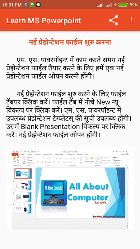 Pelajari MS PowerPoint aplikasi akan membantu Anda meningkatkan pengetahuan Anda tentang MS PowerPoint. Menggunakan aplikasi ini Anda akan dapat belajar bagaimana menggunakan aplikasi MS PowerPoint di komputer. Aplikasi ini berisi informasi tentang cara menggunakan tab yang berbeda di MS PowerPoint. Aplikasi ini akan membantu Anda untuk meningkatkan pengetahuan Anda tentang MS PowerPoint.