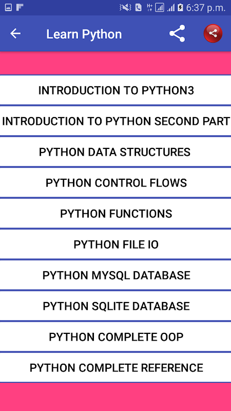 dalam aplikasi ini kita akan belajar python dari dasar hingga topik lanjutan seperti