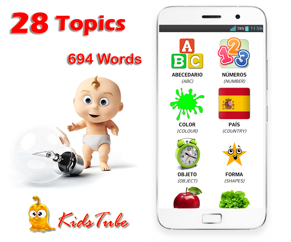 * Objek: 40 objek umum dalam kehidupan nyata. Anak-anak akan belajar objek nama Spanyol di sekitar kehidupan mereka.