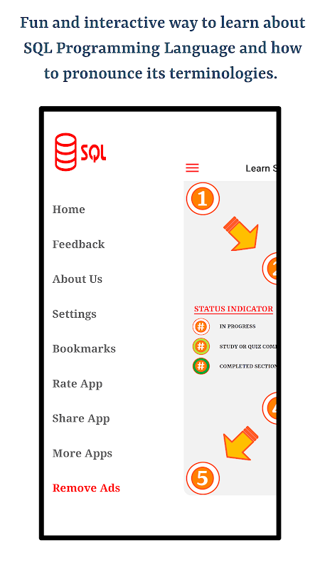 Aplikasi ini adalah sumber yang bagus untuk mempelajari tentang Bahasa Pemrograman SQL. Aplikasi ini dirancang untuk membuat pengguna memahami dengan sempurna pertanyaan Bahasa Pemrograman SQL umum dengan belajar dalam waktu yang sangat singkat. Fungsionalitas audio dan bookmark tersedia di seluruh aplikasi pada bab, bagian, mode belajar, dan mode kuis.