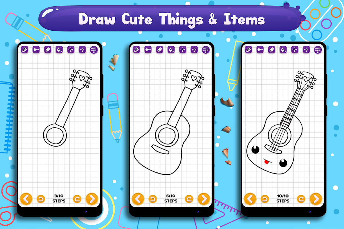 Learn to Draw Cute Things & Items is perfect app for those who want to be an artist and love drawing cute things. This App teaches you how to draw cute kawaii things in simple steps and improve your confidence of drawing and coloring.