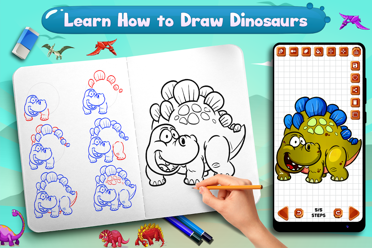 Learn to Draw Dinosaurs is perfect app for those who want to be an artist and love drawing cute dinosaurs. This App teaches you how to draw cute kawaii dinosaur in simple steps and improve your confidence of drawing and coloring.