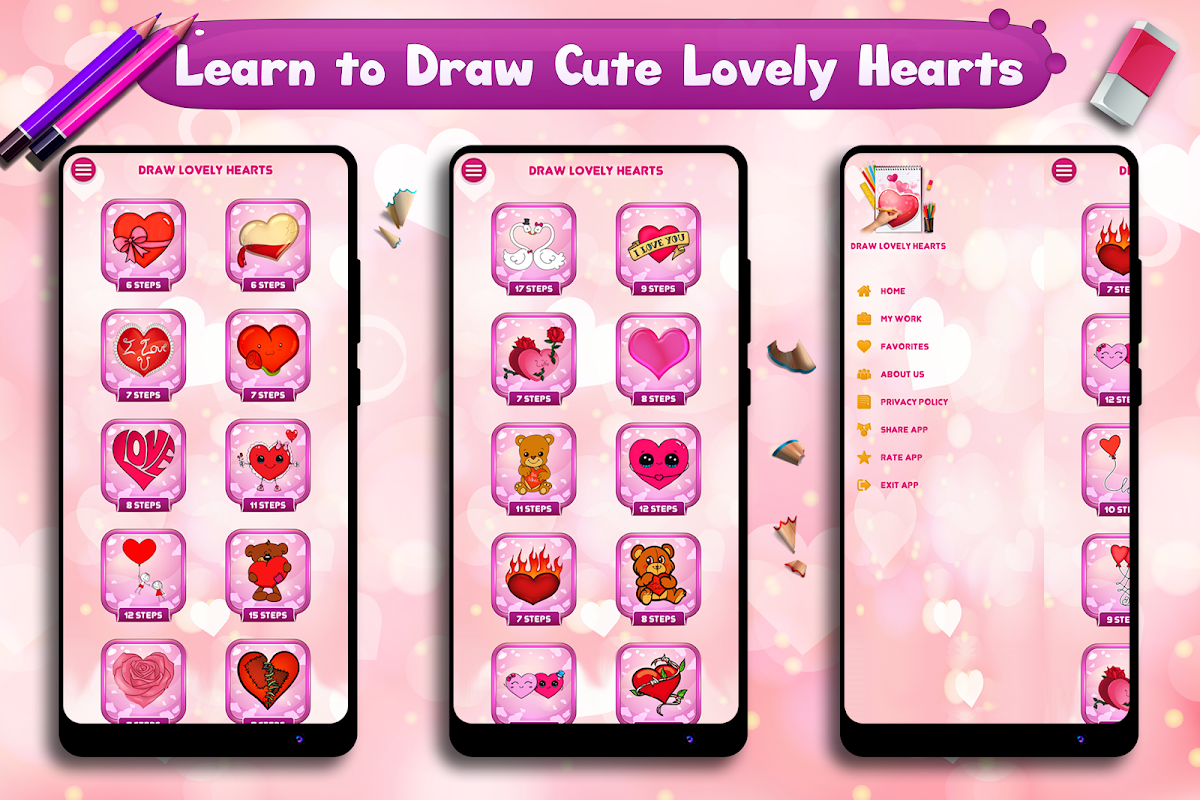 Aplikasi ini mengajarkan Anda cara menggambar hati yang indah dan lucu dalam langkah-langkah sederhana.