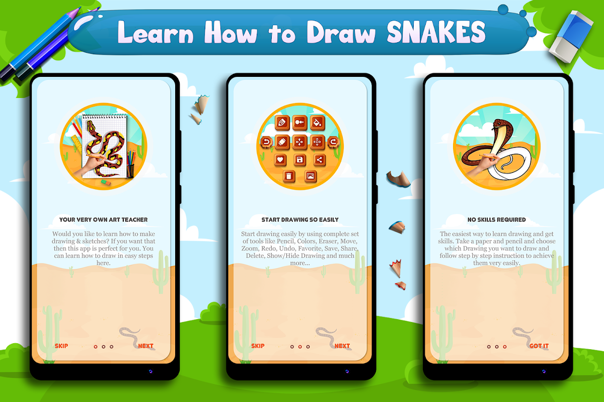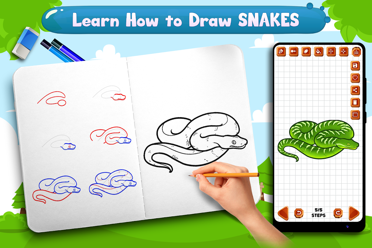 Learn to Draw Snakes is perfect app for those who want to be an artist and love drawing reptile animals. This App teaches you how to draw cute kawaii snakes in simple steps and improve your confidence of drawing and coloring.