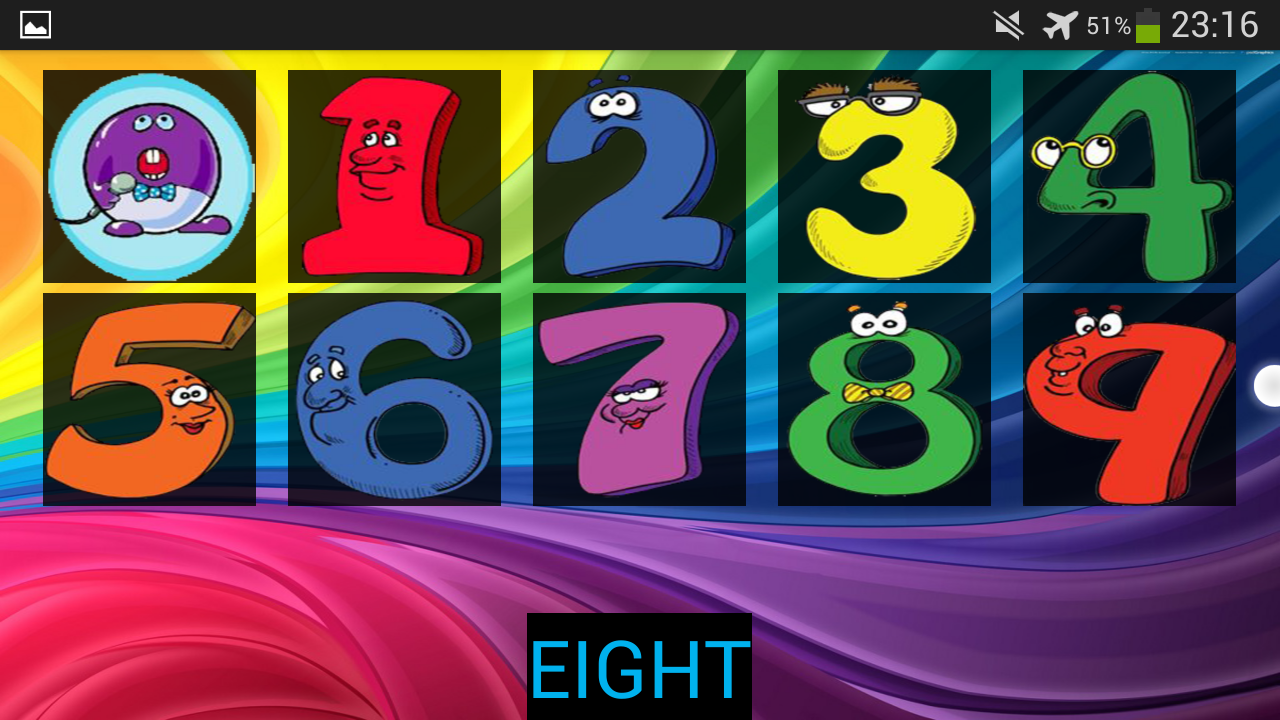 This application is primarily intended for learning the alphabet, numbers, colors, animals, music, clothes and reading for very young children.