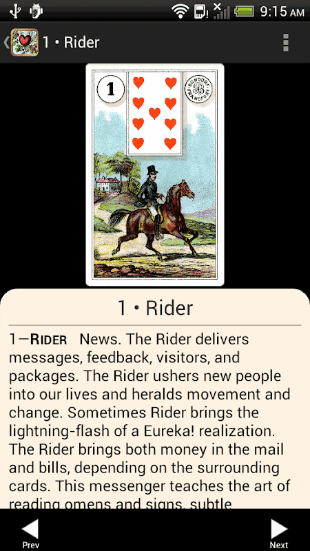 Gambar di Lenormand lebih sederhana, lebih mudah, dan lebih mudah untuk menafsirkan dari Tarot. Di Lenormand, kartu mengambil nuansa makna dari kartu tetangga. Sederet kartu Lenormand dapat dibaca seperti kalimat. Pelajari makna kartu saat bermain dengan app!