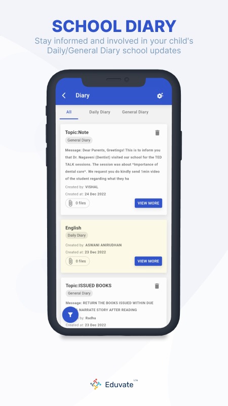 - Buku Harian Harian : Tugas kelas dan pekerjaan rumah harian yang diberikan kepada siswa dapat dilihat di sini. juga, komunikasi lain dari sekolah juga akan ditampilkan di sini.