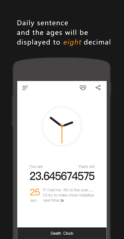 We are all aware of the importance of cherishing time and following heart. However,the fact is that we tend to forget or deviate our original desire during the daily life.As a result of which,we sincerely hope that this APP can remind people at any time of the fact that time flies by taking count of age and the prediction of death.So people can listen to their deep inside and do whatever they really want to do.