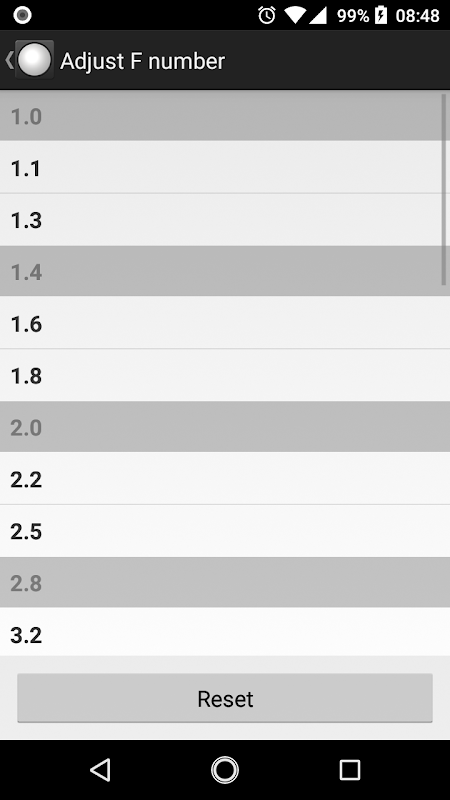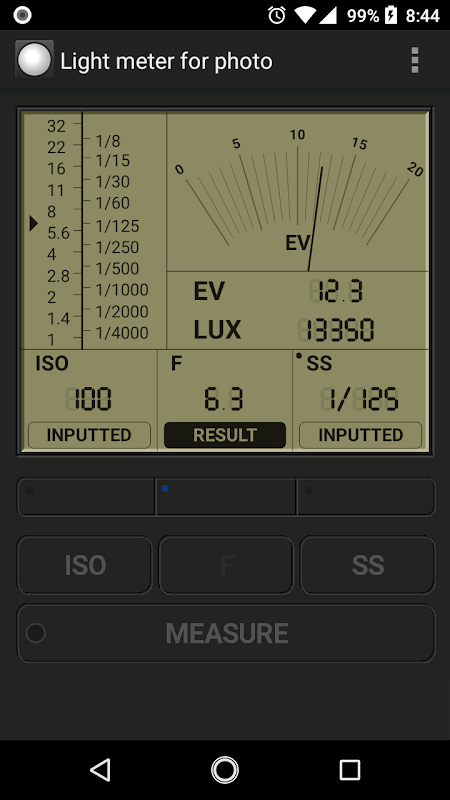 Aplikasi ini dapat mengukur 'F number', 'Shutter speed' atau 'ISO sensitivitas'.