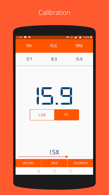 This lux light meter is simple to use. Make sure nothing is covering your phone’s light sensor. (Light sensor is usually on the top of screen). You can Save current light reading in Lux or FC. You can also view light meter readings history as well. LUX meter is suitable for measuring illuminance in your surroundings.