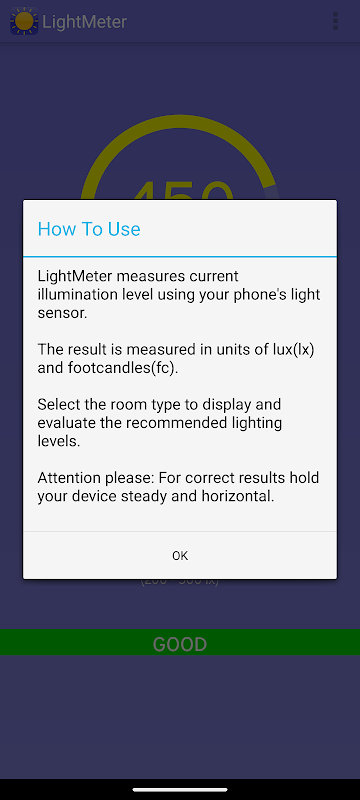 Lightmeter mengukur tingkat iluminasi saat ini menggunakan sensor cahaya ponsel Anda.
