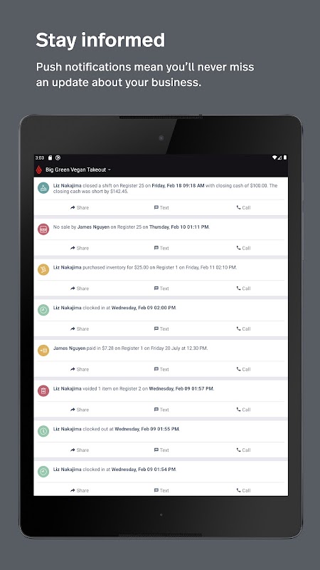 • Lihat karyawan mana yang masuk dan keluar dan temukan item terlaris Anda