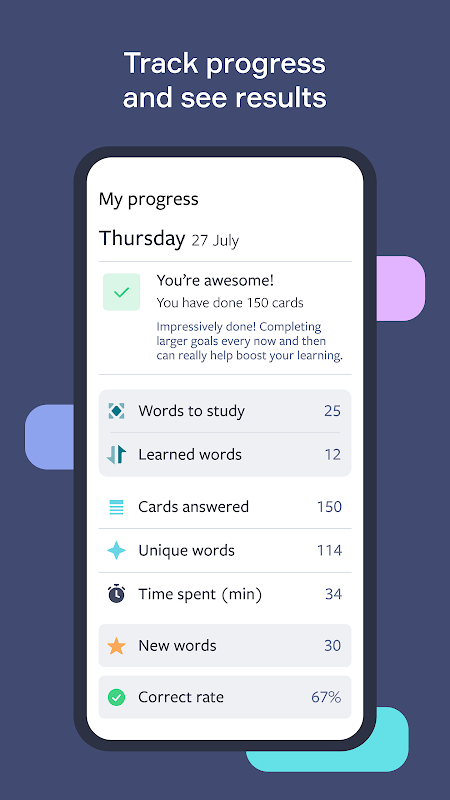 Kemajuan secara efisien dalam bahasa target Anda dengan aplikasi pembuat kosakata yang menyesuaikan dengan Anda.