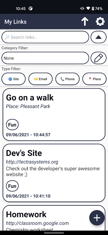 Temui LinkBoard, aplikasi sederhana dan intuitif yang memungkinkan Anda menyimpan tautan ke situs web, alamat email, lokasi, dan nomor telepon untuk nanti! Setiap link ditampilkan dalam bentuk kartu yang dapat diberi judul, deskripsi, dan kategori. Cukup ketuk kartu untuk mengunjungi tautan, tahan untuk membagikannya, dan geser untuk menghapusnya!