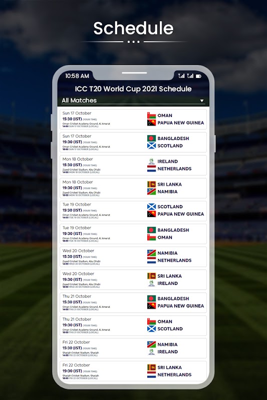 Cricket Score & Schedule also includes Cricket T20 World Cup 2021 new schedule, live score information, complete teams names, squad list and all seasons history.