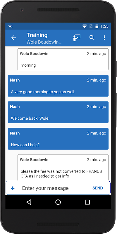 WG Obrolan Software adalah cara instan dan bebas repot untuk bisnis untuk berhubungan dengan pembeli online tanpa ribut-ribut atau menunggu panjang-kali. WG Obrolan Software sah tumpukan menghadapi layanan pelanggan kehidupan nyata dengan yang pelanggan dapat disambut dan dibantu seperti di toko bata-dan-mortir. Tanggapan melalui email atau panggilan telepon sebagian besar tertinggal dan memerlukan panjang menunggu, tapi dengan WG live chat aplikasi perangkat lunak, Anda dapat tersedia 24/7 untuk membantu pelanggan dengan permintaan mereka dari ponsel android Anda. Fakta dari masalah ini adalah bahwa pelanggan online mengalami jalan buntu sepanjang waktu saat menjelajahi web untuk pembelian yang layak dan Anda tidak bisa duduk di depan laptop atau desktop sepanjang waktu untuk membantu pelanggan secara online. Jumlah pembeli dapat dengan mudah menurun jika ada kekurangan bantuan pada website perusahaan. Namun, WG Obrolan Software app memungkinkan pelanggan cepat-akses kepada Anda untuk solusi instan dengan hanya beberapa keystrokes dari ponsel android mobile Anda.