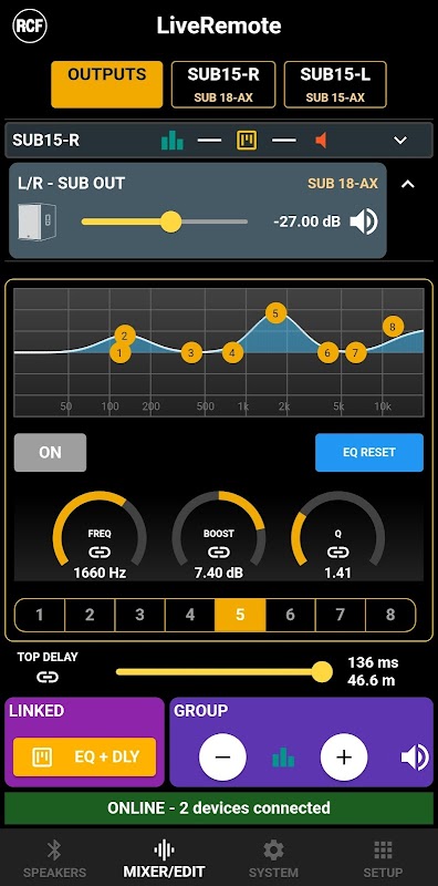 Aplikasi RCF LiveRemote memungkinkan kontrol penuh atas beberapa speaker dan subwoofer.