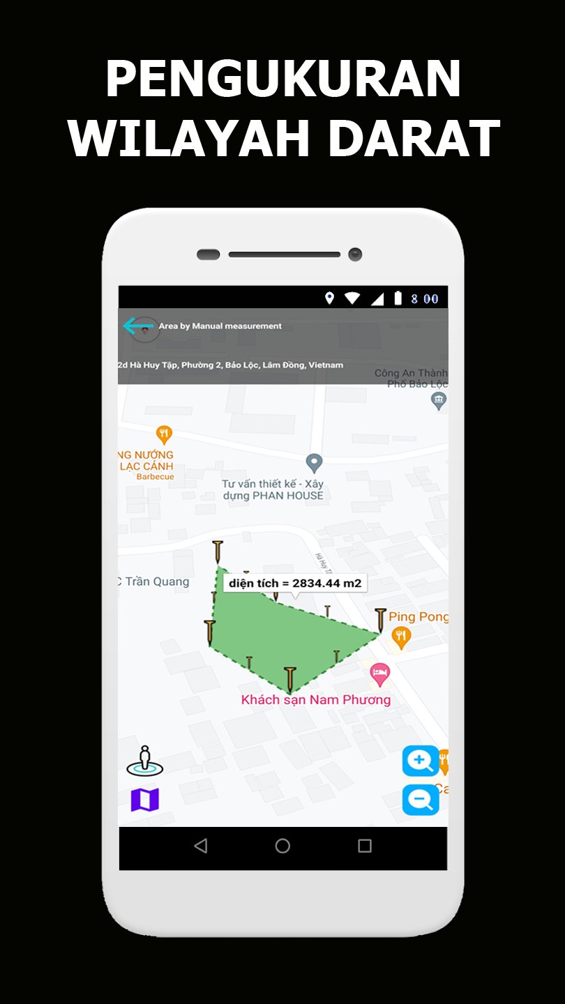 Pengukuran luas lahan dengan berjalan kaki: Anda dapat bergerak ke mana saja di dunia secara real-time, Live location share akan secara otomatis menghitung luas area dan menampilkan hasilnya di layar.