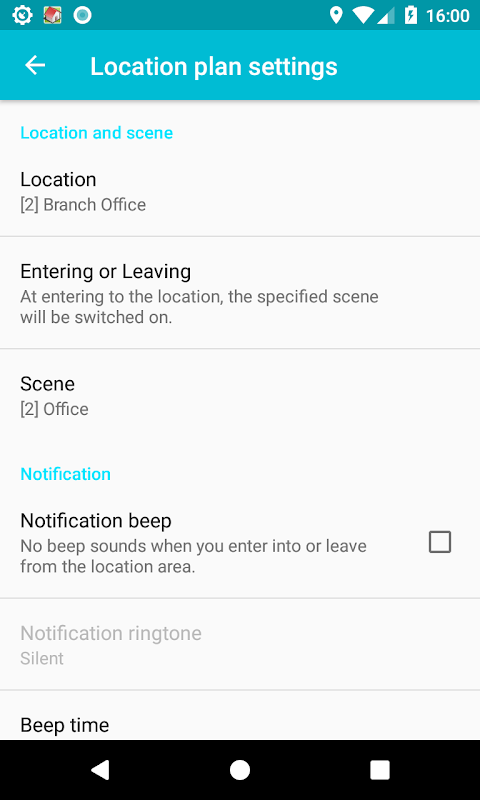 3)Set the scene you want to change when you are entering to the location or when you are leaving from the location. Also as the notification, you can set beep sound, vibrate, etc.