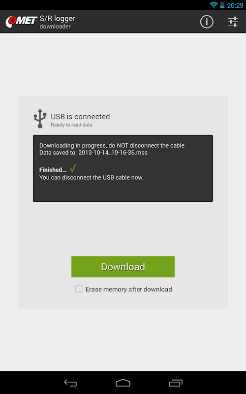 This application is used for downloading data from data loggers series S and R that are produced by COMET System company. Files with a measured data are stored in the mobile device memory.