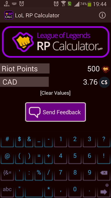 LoL RP Calc adalah aplikasi kecil, dan merupakan pendamping pertandingan Liga ideal Legends. Dengan itu, Anda dapat dengan mudah menghitung jumlah RP Anda dapat membeli pada waktu tertentu, atau sebaliknya, berapa banyak akan biaya RP penampilan legendaris. Hanya log nilai, dan Anda akan mendapatkan konversi mata uang Anda sendiri langsung.