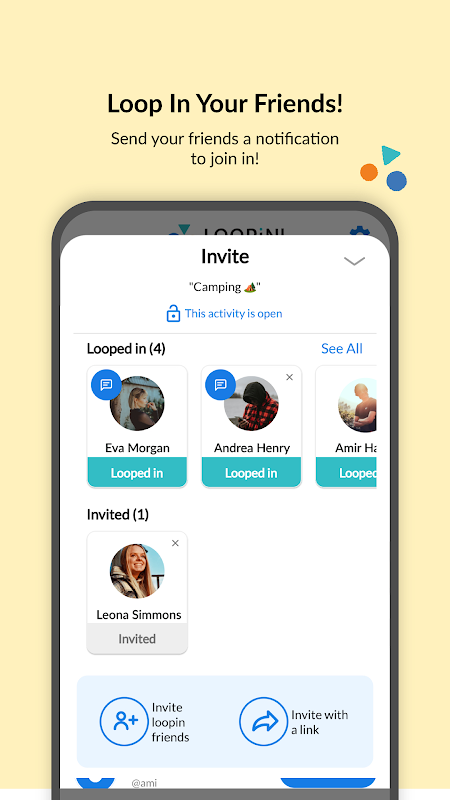 Gunakan LOOPiN untuk menyiapkan rencana dalam waktu singkat. Dengan beberapa ketukan tombol, buat aktivitas dan kirimkan pemberitahuan kepada teman Anda untuk bergabung dan mengundang orang lain. Sesederhana itu!